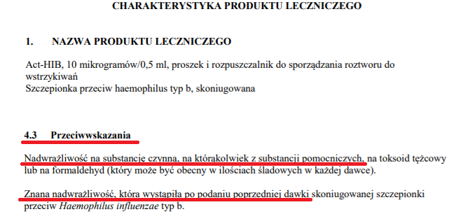 Zwróćcie uwagę, że nawet sam producent szczepionki (np. ActHib) wyraźnie odróżnia nadwrażliwość na składniki szczepionki od „znanej nadwrażliwości”, która wystąpiła po wcześniejszych szczepieniach: