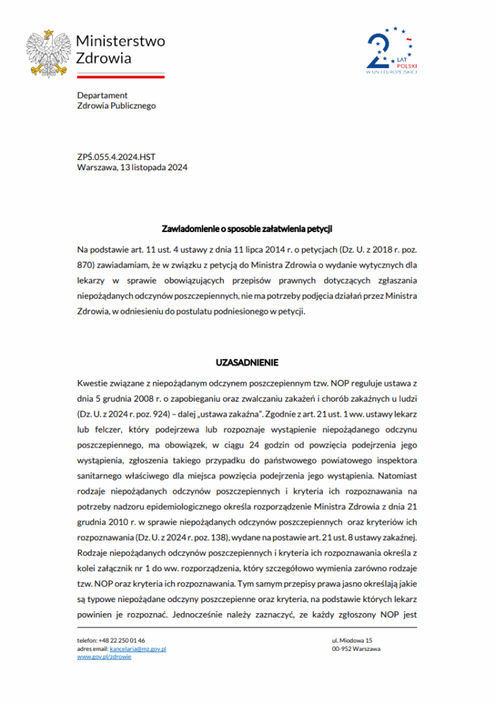 Petycja do Narodowego Instytutu Zdrowia Publicznego PZH – Państwowego Instytutu Badawczego, Ministerstwa Zdrowia oraz Głównego Inspektoratu Sanitarnego w sprawie wprowadzenia automatycznego systemu zgłaszania niepożądanych odczynów poszczepiennych (NOP) Szanowni Państwo, My, niżej podpisani, zwracamy się z uprzejmą prośbą o wprowadzenie automatycznego systemu zgłaszania niepożądanych odczynów poszczepiennych (NOP) w przypadku zgonów, hospitalizacji lub porad lekarskich, które mają miejsce w ciągu 28 dni od przyjęcia szczepionki. Obecny system zgłaszania NOP, oparty na ręcznym raportowaniu, jest wysoce nieefektywny – szacuje się, że rejestruje zaledwie mniej niż 1% przypadków NOP. Taka sytuacja znacząco obniża wiarygodność statystyk, utrudnia rzetelne monitorowanie bezpieczeństwa szczepień i ogranicza możliwość skutecznego reagowania na potencjalne zagrożenia. Jednocześnie dane dotyczące zgonów, hospitalizacji i wizyt lekarskich są już automatycznie przekazywane do Platformy P1 oraz bazy PESEL, co oznacza, że technologicznie możliwe jest wdrożenie automatycznego systemu zgłaszania NOP bez konieczności tworzenia nowej infrastruktury. Wprowadzenie takiego rozwiązania przyniosłoby szereg korzyści: Zwiększenie przejrzystości i poprawa jakości danych – bardziej wiarygodne statystyki umożliwiłyby lepsze zrozumienie ryzyka związanego ze szczepieniami oraz skuteczniejsze działania prewencyjne, co leży w gestii Narodowego Instytutu Zdrowia Publicznego PZH, publikującego dane w biuletynach „Szczepienia ochronne w Polsce”. Usprawnienie nadzoru nad bezpieczeństwem szczepień – Główny Inspektorat Sanitarny, odpowiedzialny za monitorowanie NOP, mógłby efektywniej wypełniać swoje obowiązki dzięki automatycznemu dostępowi do pełniejszych informacji. Rozwój cyfryzacji ochrony zdrowia – Ministerstwo Zdrowia, nadzorujące system e-zdrowia i Platformę P1, mogłoby wykorzystać istniejące narzędzia do zwiększenia zaufania społecznego do programów szczepień oraz poprawy jakości decyzji dotyczących zdrowia publicznego. Wierzymy, że automatyczne zgłaszanie NOP w przypadkach zgonów, hospitalizacji i porad lekarskich w ciągu 28 dni od szczepienia jest krokiem koniecznym do podniesienia standardów monitorowania bezpieczeństwa szczepień w Polsce. Brak dotychczasowych działań w tym kierunku, mimo dostępności technologii, budzi nasze zdziwienie i podkreśla pilność tej sprawy. Zwracamy się do Państwa – Narodowego Instytutu Zdrowia Publicznego PZH, Ministerstwa Zdrowia oraz Głównego Inspektoratu Sanitarnego – o współpracę w celu opracowania i wdrożenia automatycznego systemu zgłaszania NOP. Liczymy na szybkie podjęcie działań, które przyczynią się do zwiększenia przejrzystości, poprawy bezpieczeństwa zdrowotnego oraz wzmocnienia zaufania społecznego do systemu ochrony zdrowia.