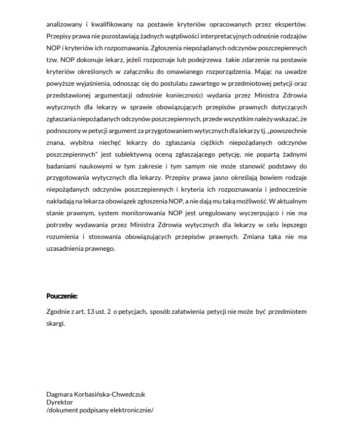 Treść Rozporządzenia Ministra Zdrowia w sprawie niepożądanych odczynów poszczepiennych oraz kryteriów ich rozpoznawania nie udziela odpowiedzi na żadne z powyższych pytań, stąd niniejsza petycja jest w pełni zasadna, bowiem udostępniona publicznie odpowiedź Ministra Zdrowia na powyższe pytania (do czego Ministra Zdrowia na szczęście zobowiązuje ustawa o petycjach) wydatnie pomoże lekarzom w podejrzewaniu oraz rozpoznawaniu niepożądanych odczynów poszczepiennych, co bez wątpienia leży w interesie publicznym, ponieważ tylko rzetelne zgłaszanie przez lekarzy każdego niepożądanego odczynu poszczepiennego umożliwi rzetelną ocenę bezpieczeństwa szczepień populacyjnych.