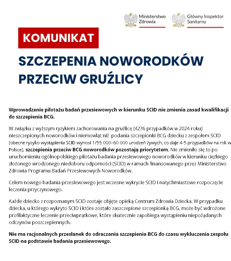 "W związku z wyższym ryzykiem zachorowania na gruźlicę (4236 przypadków w 2024 roku) nieszczepionych noworodków i niemowląt niż podania szczepionki BCG dziecku z zespołem SCID (obecne ryzyko wystąpienia SCID wynosi 1/55 000–60 000 urodzeń żywych, co daje 4-5 przypadków na rok w Polsce), szczepienia przeciw BCG noworodków pozostają priorytetem."